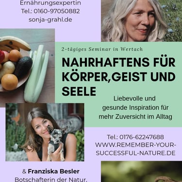 Ein Seminar, das Dich stärkt, inspiriert und begleitet – mit wertvollen Impulsen und intensiven Erfahrungen rund um Dein Leben und Deine Ernährung. Es geht um eine bereichernde Ergänzung für Deinen Alltag – ganz ohne Druck oder Verpflichtung, fernab von jedem "muss".